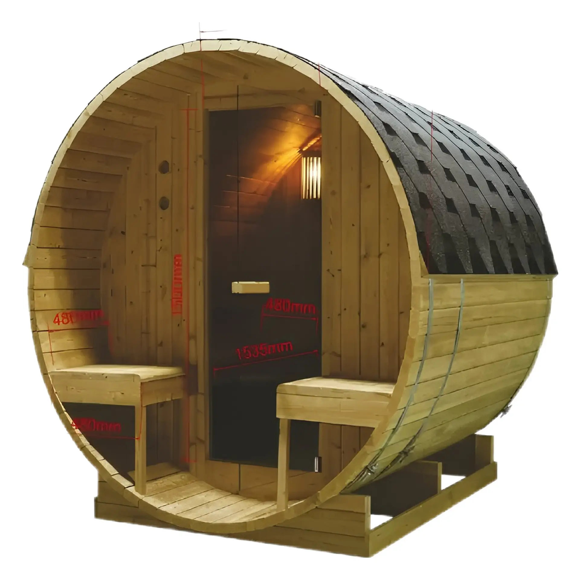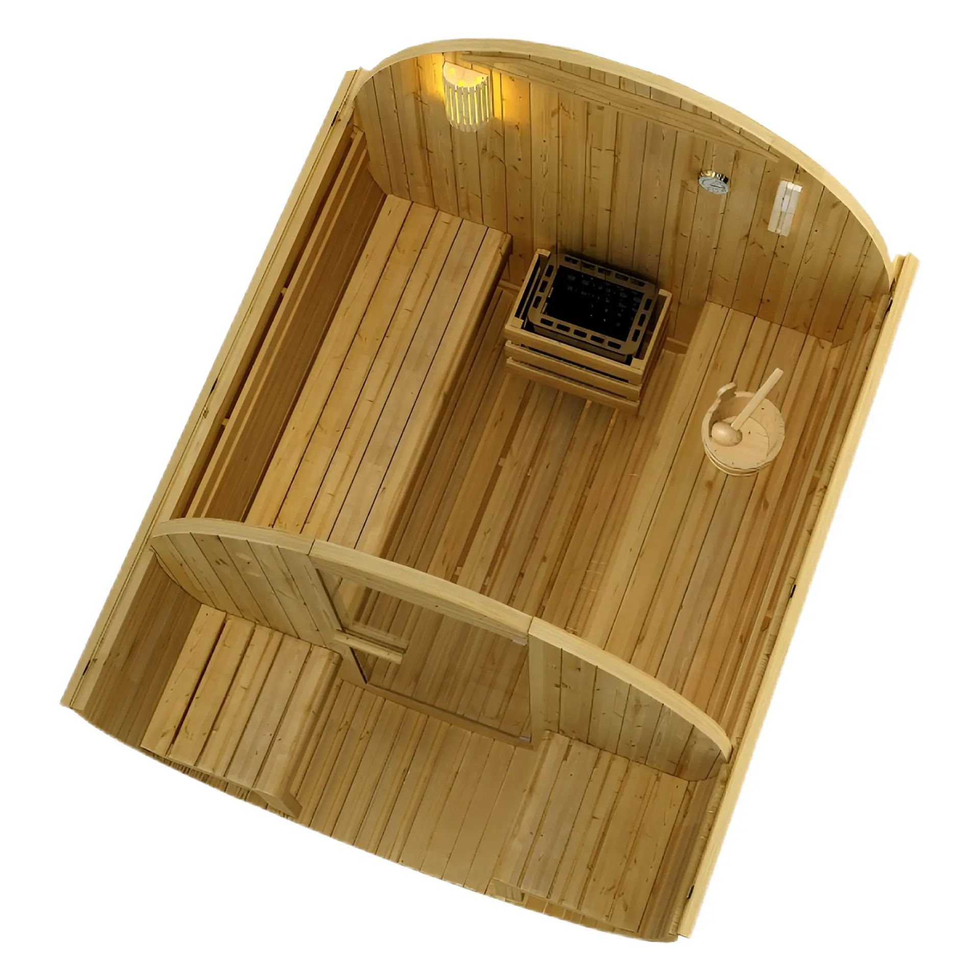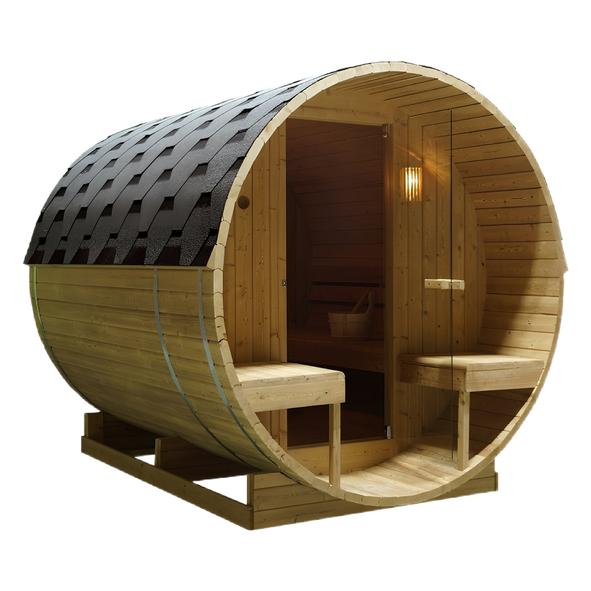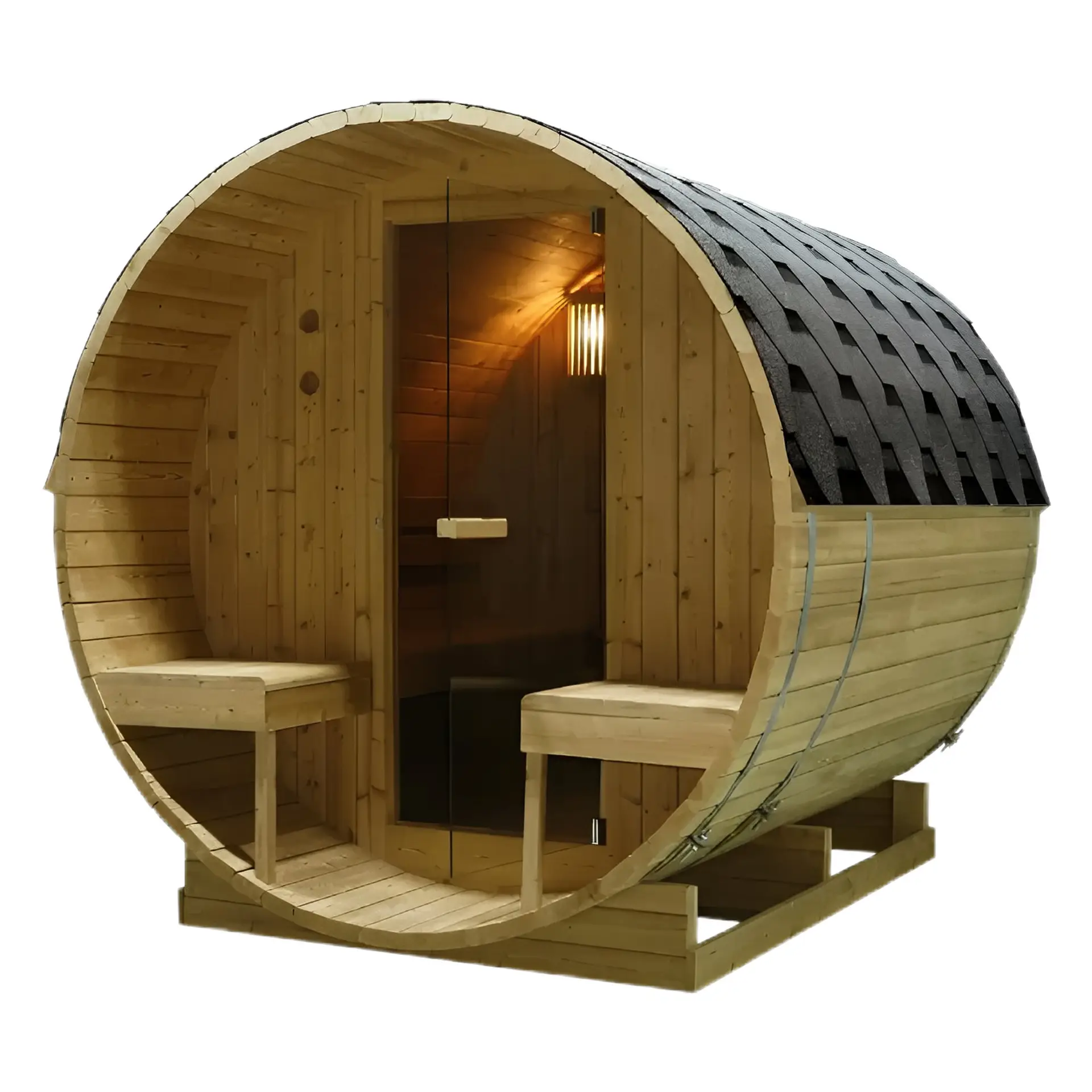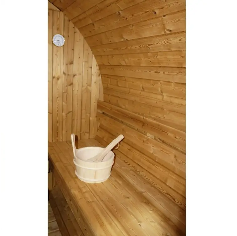 Рустик дизайн, първокласна изработка: Външната сауна, наподобяваща бъчва – „Bergen“ се характеризира с традиционния си дизайн, който е изработен от опитни майстори с внимание към детайла. Изработена от висококачествена дървесина, известна със своята издръжливост, всяка сауна се превръща в шедьовър на майсторството, създавайки топла и приветлива атмосфера.