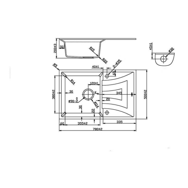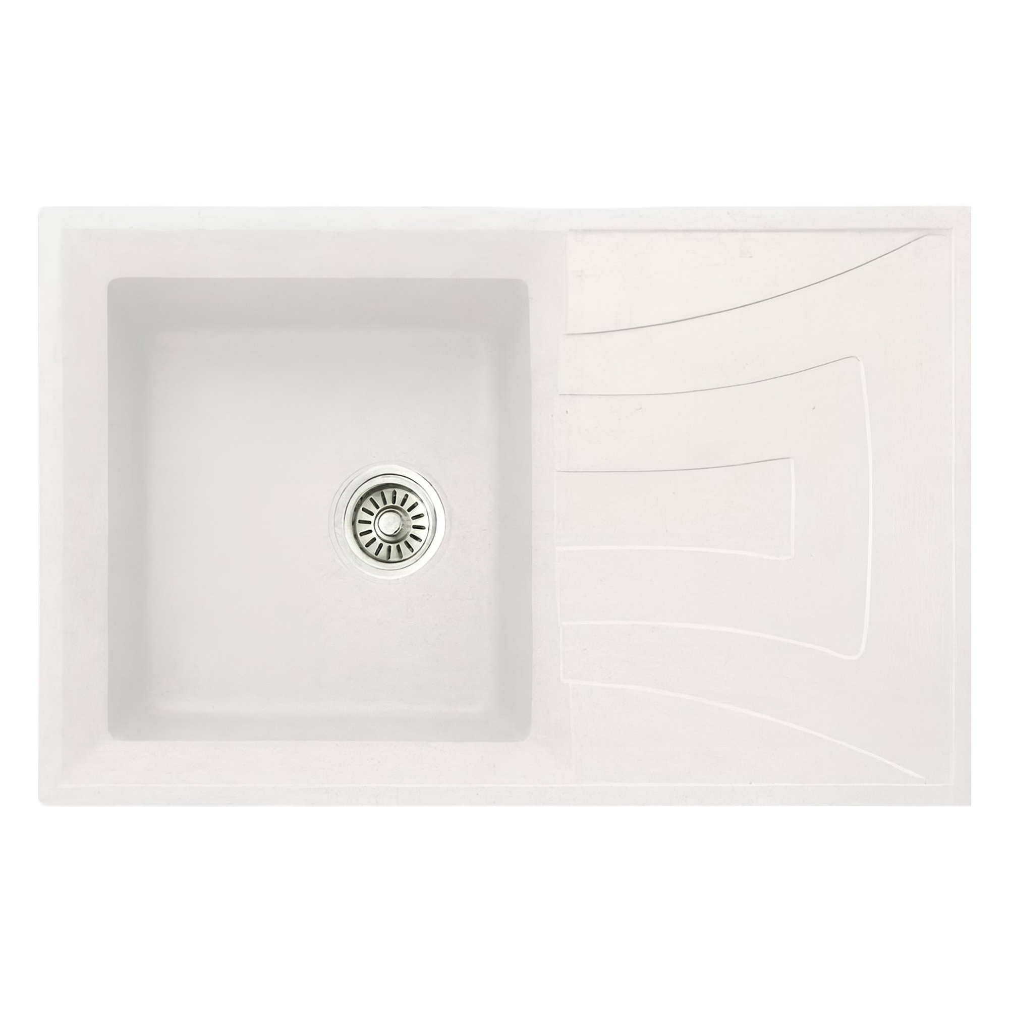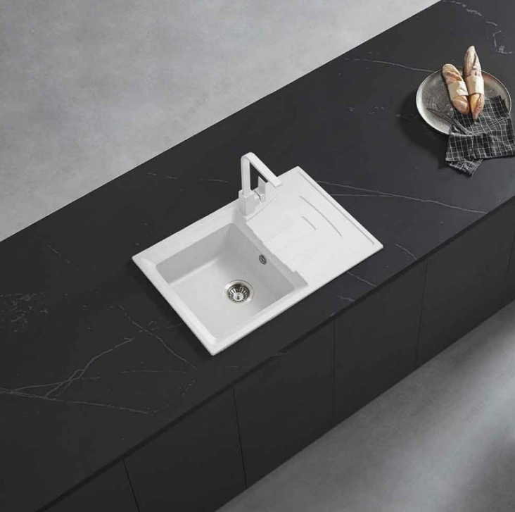 Квадратна гранитна мивка за плот в бял цвят със сифони и комплект за закрепване.