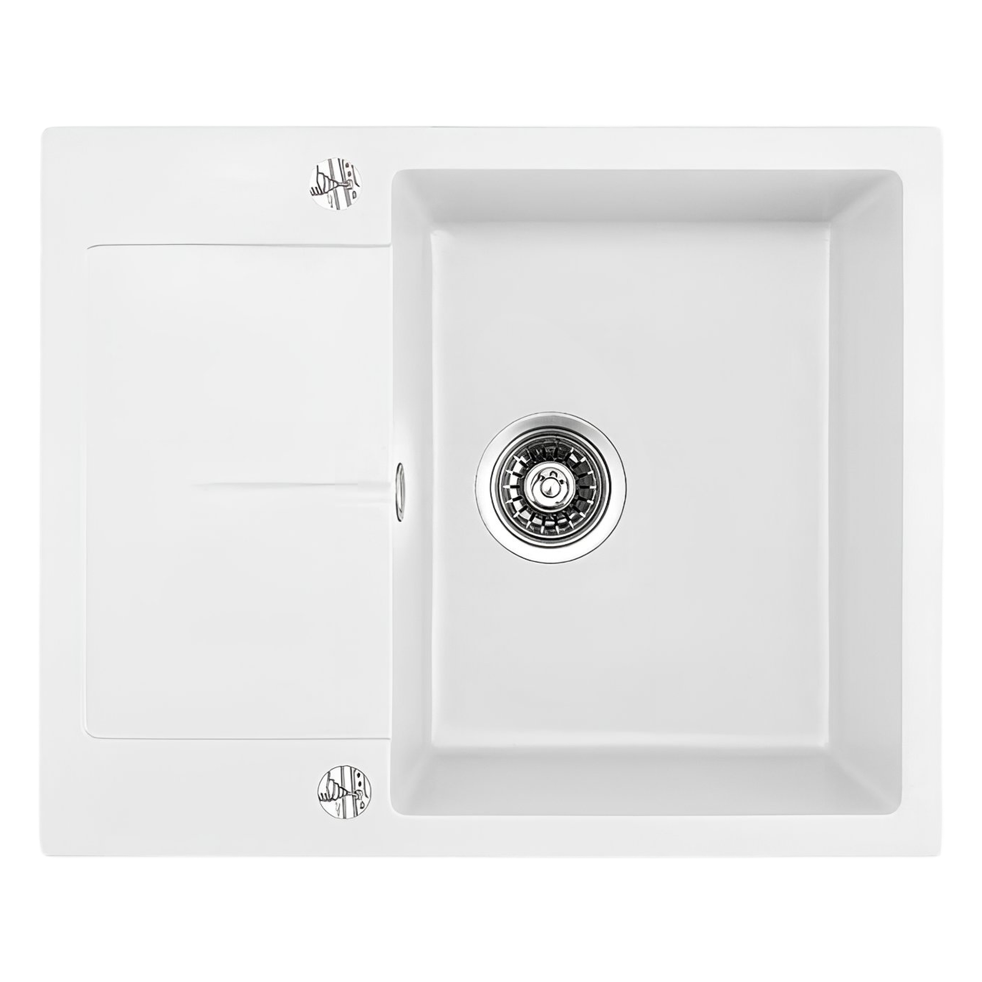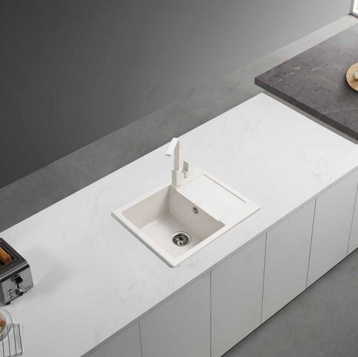 Квадратна гранитна мивка за плот в бял цвят със сифони и комплект за закрепване.