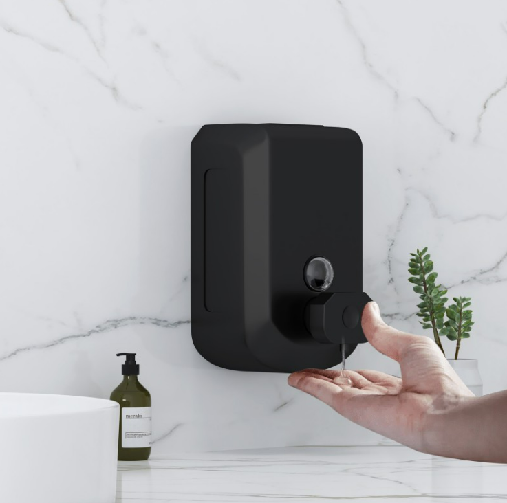 Дозатор за течен сапун, изработен от неръждаема стомана 304, подходящ за монтаж на стена.