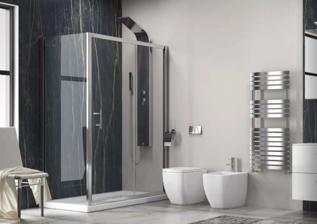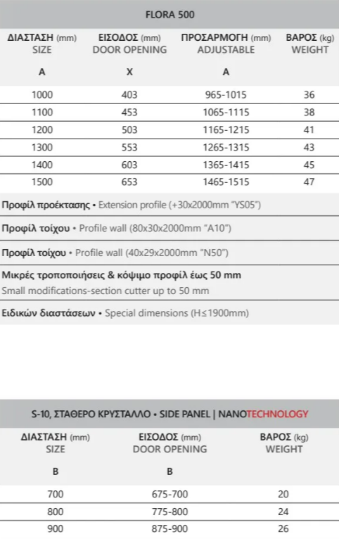 Душ кабина FLORA 500 & S-10 с хром профили и прозрачно закалено стъкло 6mm. Състои се от стационарна част и една плъзгаща се врата. Nano-skin технологията предотвратява натрупването на замърсяване и осигурява оптимална хигиена.