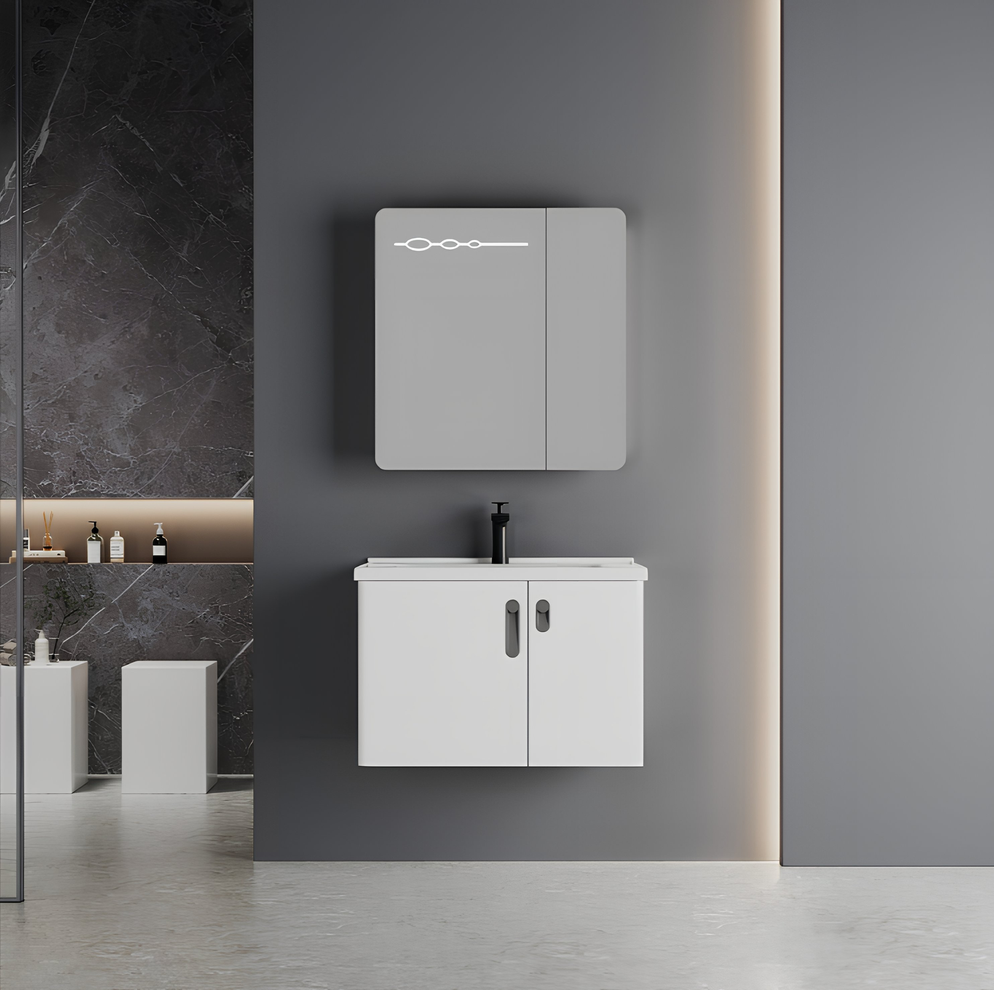 – Горен шкаф за баня от PVC с LED огледало