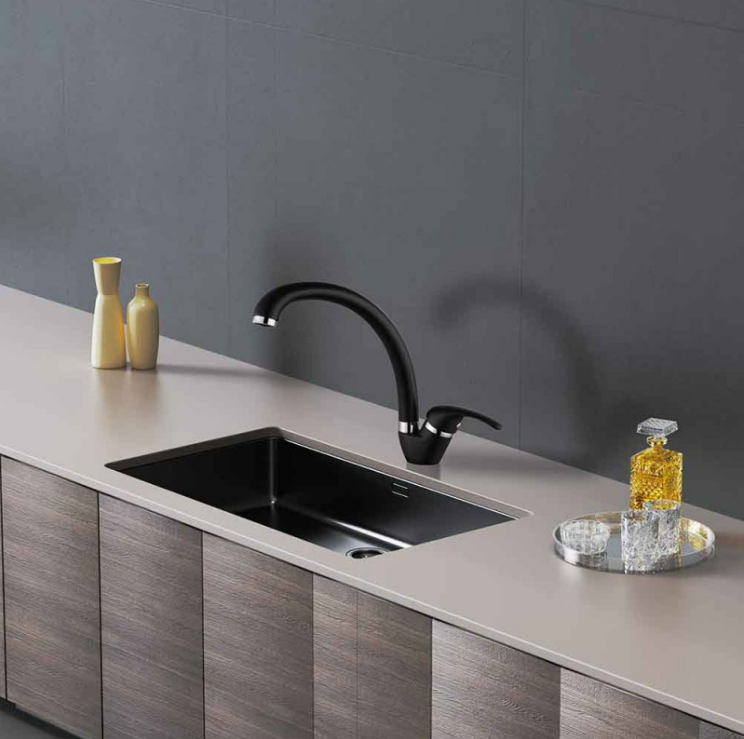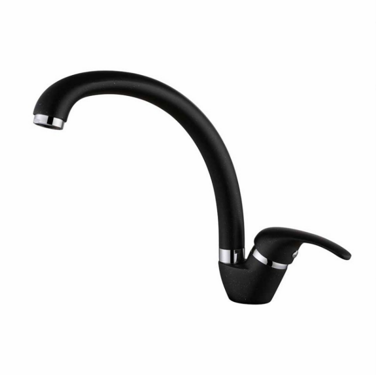 Месингов едноръкохватков кухненски смесител в черен гранитен цвят.