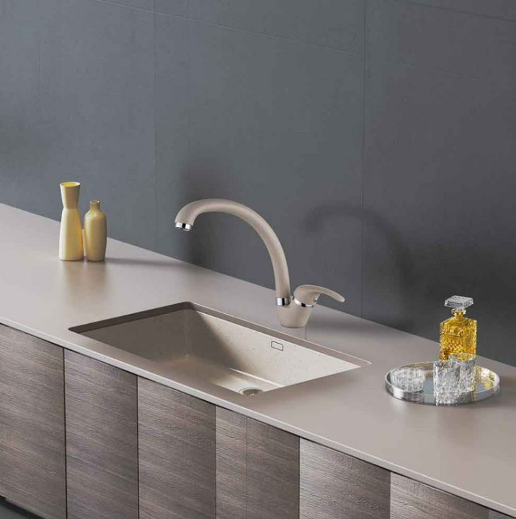 Месингов едноръкохватков кухненски смесител в пясъчен гранитен цвят.
