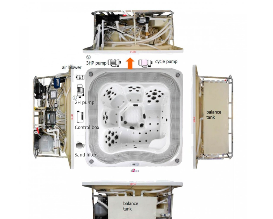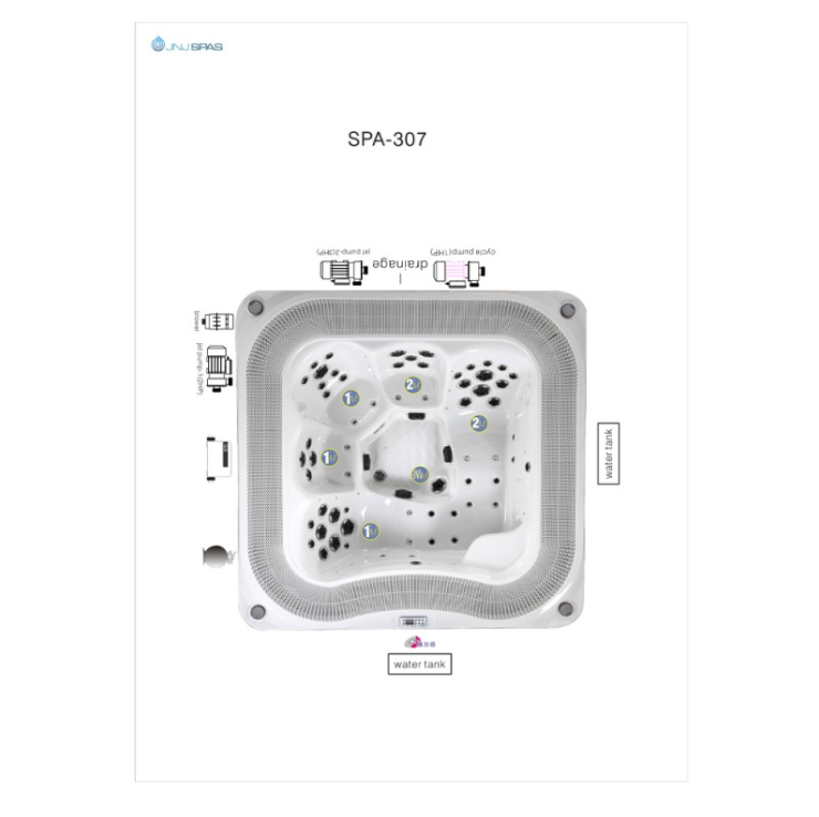 Хидромасажната вана(джакузи) за вграждане SPA-307 разполага с 45 хидромасажни дюзи и е предназначен за терапевтични водни процедури. Масажните струи действат върху раменете, гърба, краката и стъпалата, като подобряват кръвообращението. Процедурите помагат за отпускане на мускулите и ставите, облекчаване на стреса и напрежението, намаляване на мускулните болки. Басейнът е направен по преливна схема. С увеличаване на броя на хората водата прелива отстрани и през водосборните тави се събира в компенсационни резервоари. Когато хората напуснат басейна, интелигентната система връща водата от водосборните резервоари.