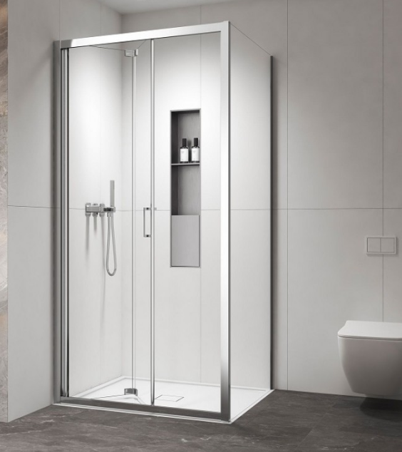 Vivox 400 CHROME & L – 3811– параван за баня от две сгъваеми части с водещи релси и страничен стационарен параван, прозрачно стъкло 6мм. Този параван е идеален за малки бани като осигурява максимален комфорт.